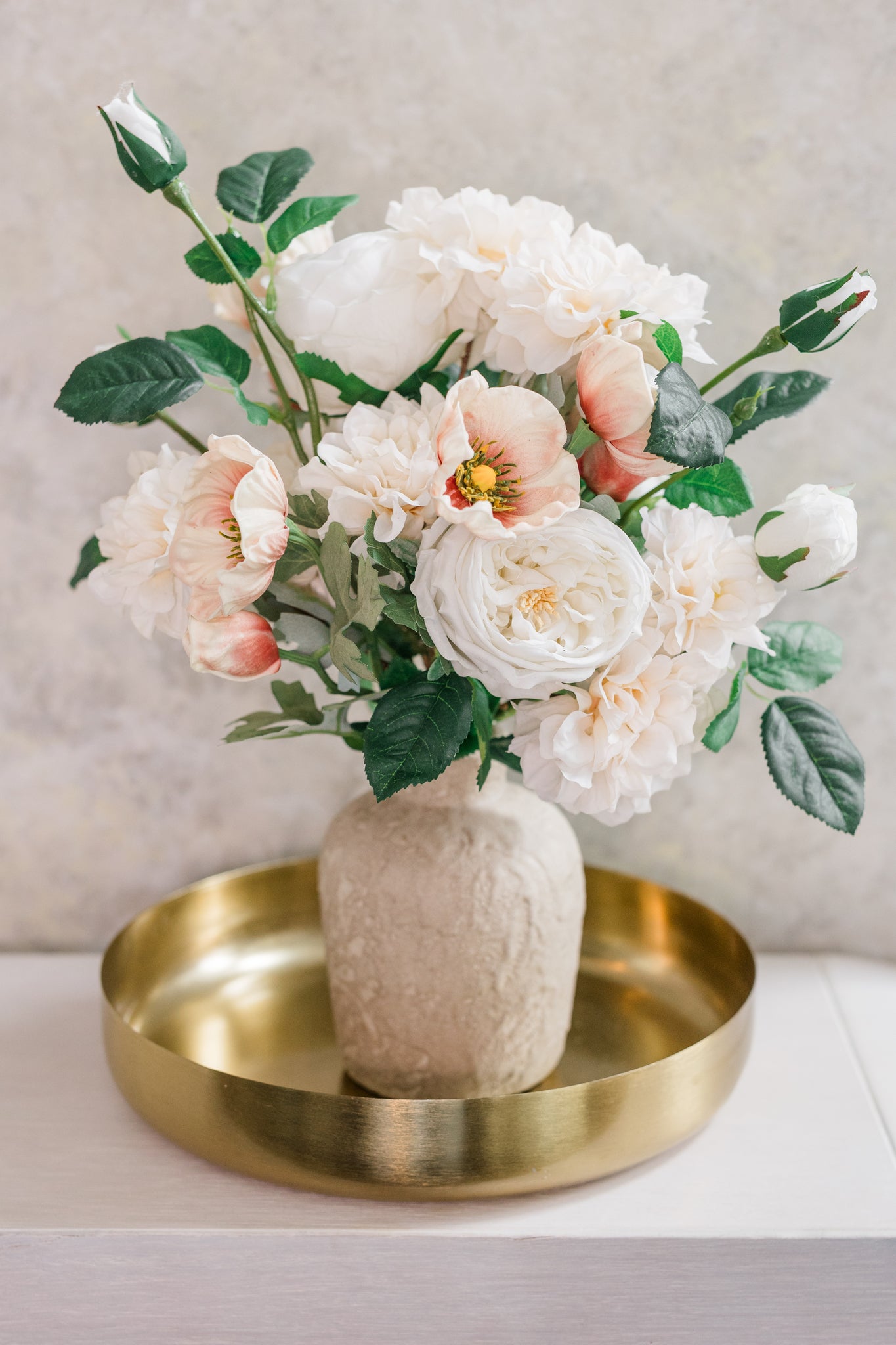 Grace your home with the soft romance of our Blush & Bloom Bouquet. This hand-curated arrangement features lifelike stems of creamy cabbage roses, blush-toned anemones, hibiscus peonies, and delicate buds, artfully balanced with lush green foliage. The gentle contrast of warm blush and crisp ivory blooms creates a timeless, transitional look—perfect for any season.