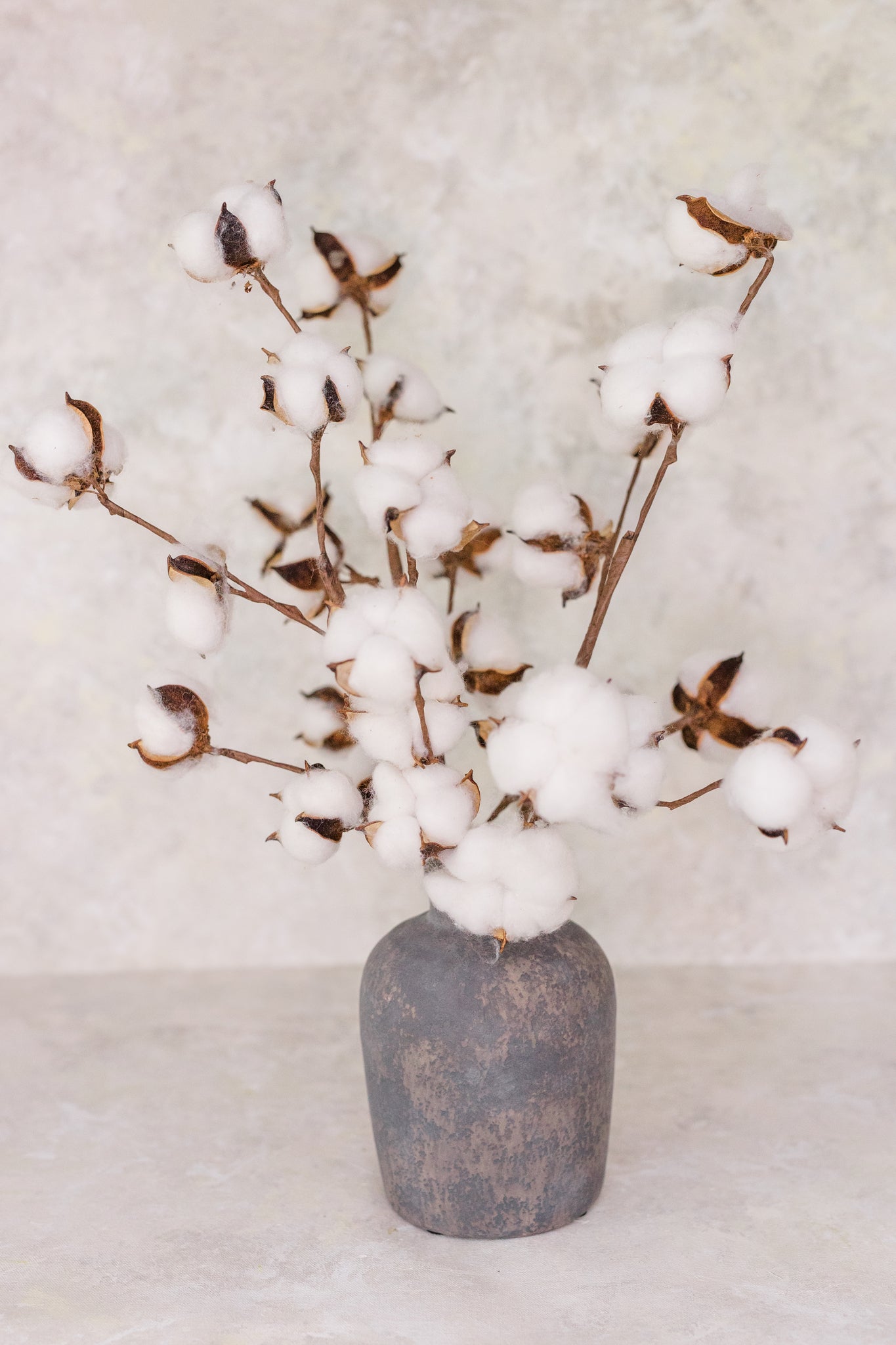 Our cotton stems stand 21 inches tall and feature 10 soft, fluffy blossoms per stem*, each about 2 inches wide. Sold in sets of three, these stems bring a cozy, natural texture to any arrangement or decor. Their neutral tones and delicate appearance make them perfect for adding a touch of farmhouse charm or understated elegance to your space.